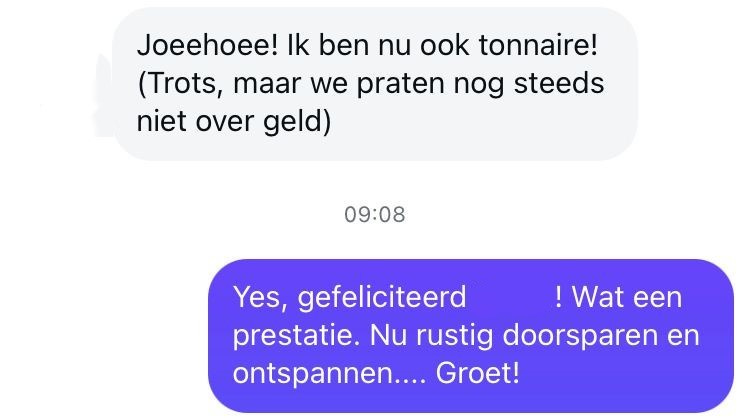 Om mezelf te trainen in besparen, sparen en beleggen verzon ik een doel: ik zou tonnair worden. 100.000 euro moest ik op de bank hebben staan. Het maakte me niet uit hoe, al moest ik een jaar geen kleding kopen, een tweedehands pannenlikker kopen en alle spaar- en beleggingsrekeningen van Nederland uitpluizen op zoek naar de beste investering.