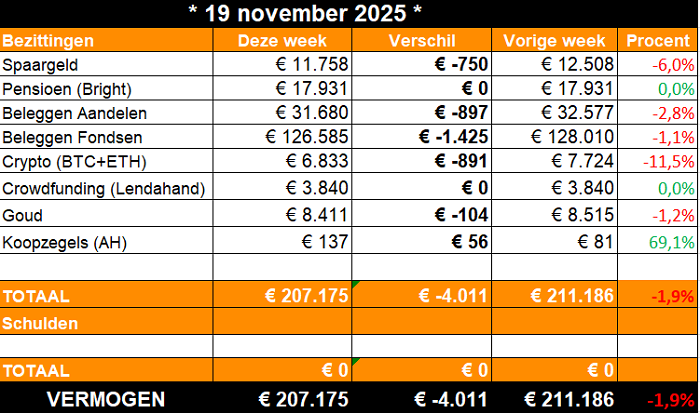 Een probleem komt nooit alleen. Ik heb wat cashflowproblemen (de -750 euro op mijn spaargeld). Crypto stort in elkaar (ik had toch alles in september moeten verkopen). Aandelen doen het slecht. En zelfs goud heeft de weg naar beneden kunnen vinden.