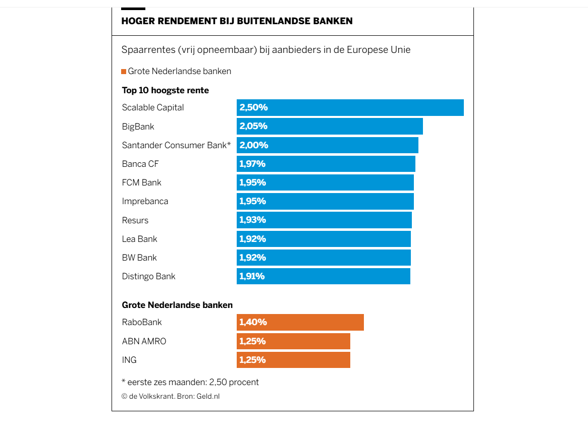 Geluk bij een ongeluk: de spaarrentes gaan weer stijgen. 'Het hoogste rendement op een vrij opneembare bankrekening binnen de Europese Unie steeg de afgelopen maand naar 2,5 procent,' schrijft de Volkskrant. De Nederlandse banken blijven uiteraard achter. Ik heb zelf geen buitenlandse spaarrekening. Maar als je niet belegt en enkel spaart, dan kan dit interessant zijn.