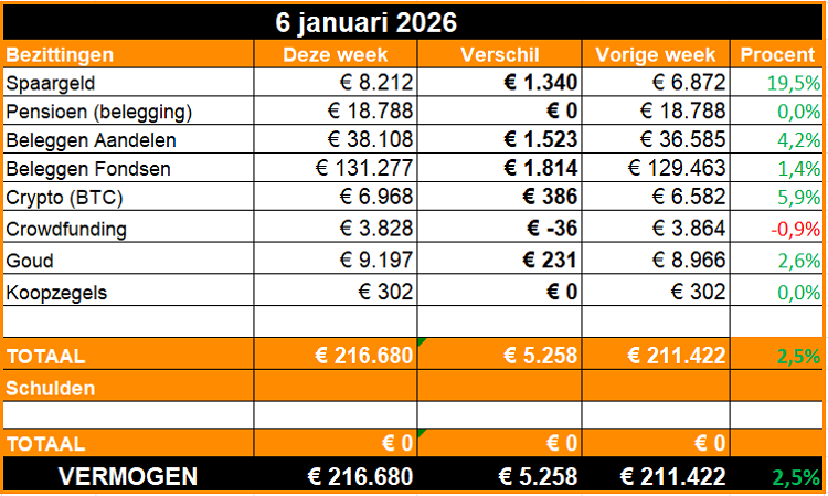 Spaargeld. Hier heb ik veel lopen schuiven. Er stond tot 1 januari wat extra geld op mijn zakelijke rekening (onbelast wat betreft vermogen), dat heb ik nu wel overgezet. Daarvan heb ik dan ook gelijk mijn zorgverzekering voor het hele jaar betaald (1575 euro) én de voorlopig aanslag van de Belastingdienst voor 2026 (om en nabij de 3000 euro). Het bedrag wat hier nu staat heb ik netto kunnen inleggen in mijn vermogen.