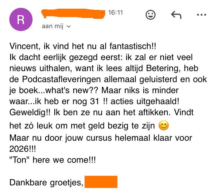 ‘Ik dacht eerlijk gezegd eerst: ik zal er niet veel nieuws uithalen, want ik lees altijd Betering, heb de Podcastafleveringen allemaal geluisterd en ook je boek. Maar niks is minder waar...ik heb er nog 31 !! acties uitgehaald! Geweldig. Vind het zó leuk om met geld bezig te zijn 😊 Nu door jouw cursus helemaal klaar voor 2026! “Ton” here we come!’ - Rachel