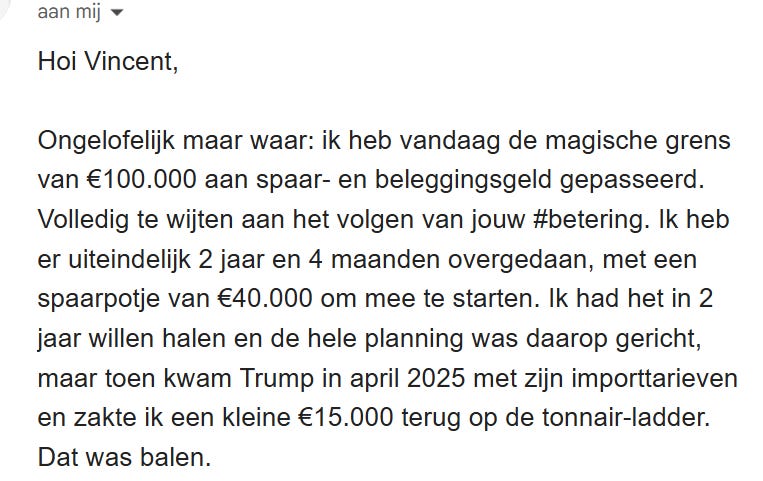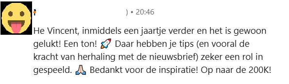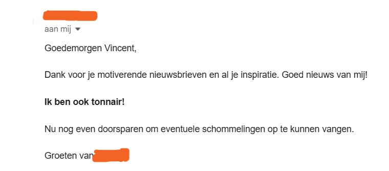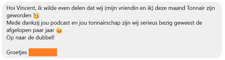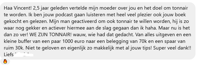 ‘Ha Vincent, ik ben enorm geïnspireerd geraakt door je podcast / boek / nieuwsbrief en nu ook door je cursus over geld. Ik volg alles met plezier en heb door jouw werk nu (veel meer) plezier in geld. Dank daarvoor.’ - Milou