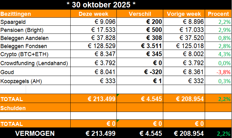 Zonder noemenswaardig veel geld gespaard te hebben deze week (200 euro naar de buffer, 500 naar de pensioenrekening en 1 knaak aan koopzegels), ben ik door de 210K gebroken, als een mes door de boter.