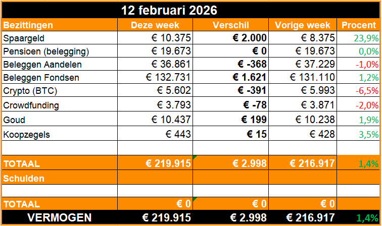 3.115 euro is deze week dus inleg. De vermogensgroei is 2.998 euro. Dus netto noteer ik een verliesje.